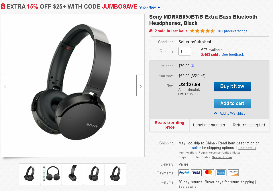 Sony Extra Bass Bluetooth Headphones, Black