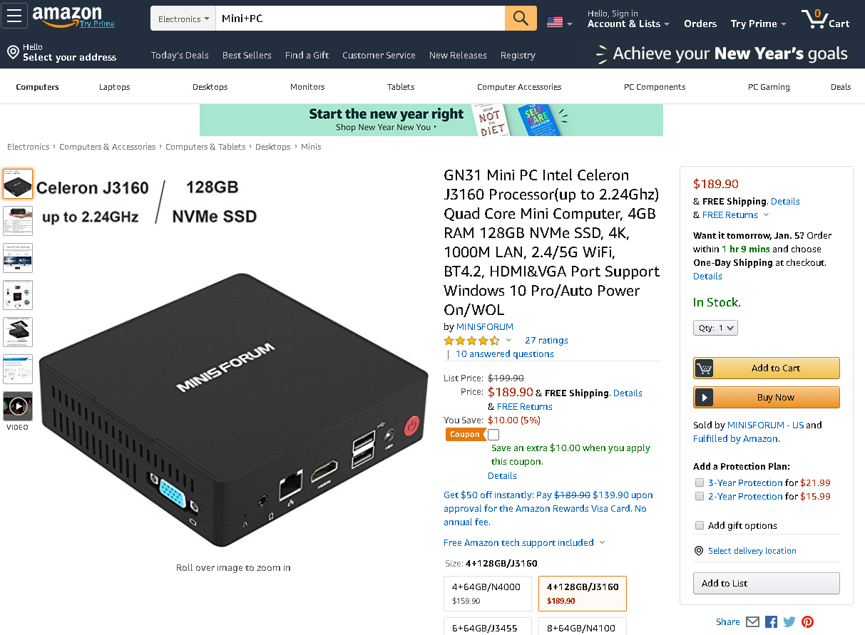 | ✔️ | [AMAZON] $189.90 GN31 Mini PC Intel Celeron J3160 Processor(up to 2.24Ghz) Quad Core Mini Computer, 4GB RAM 128GB NVMe SSD, 4K, 1000M LAN, 2.4/5G WiFi, BT4.2, HDMI&VGA Port Support Windows 10 Pro/Auto Power On/WOL 🔗 🖼️ | Fandom | 575 | 1/0 | 20.01.04 13:13 |